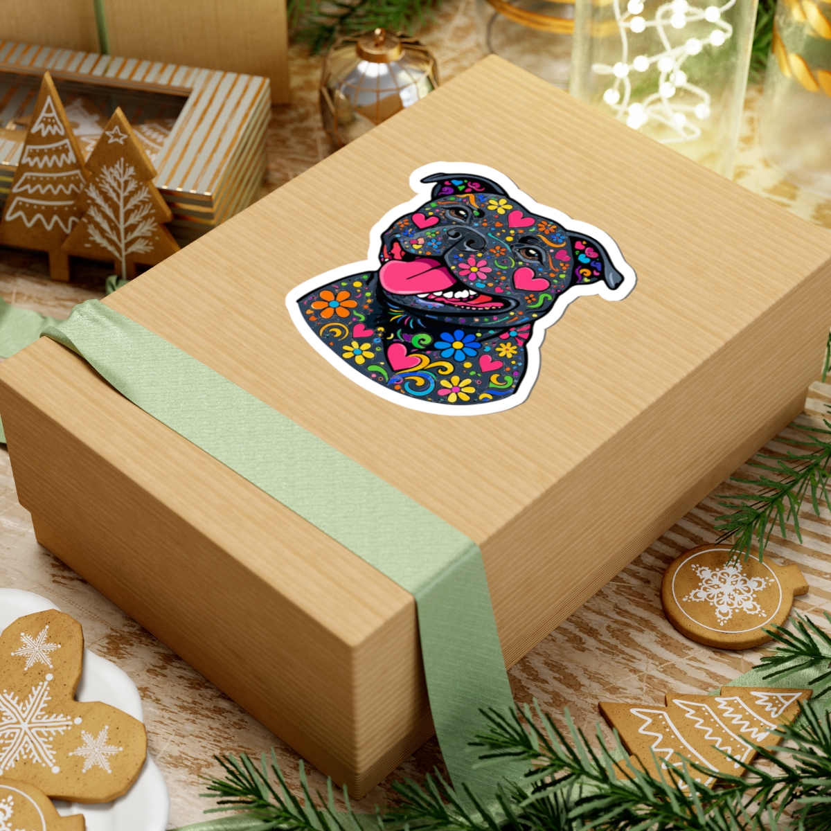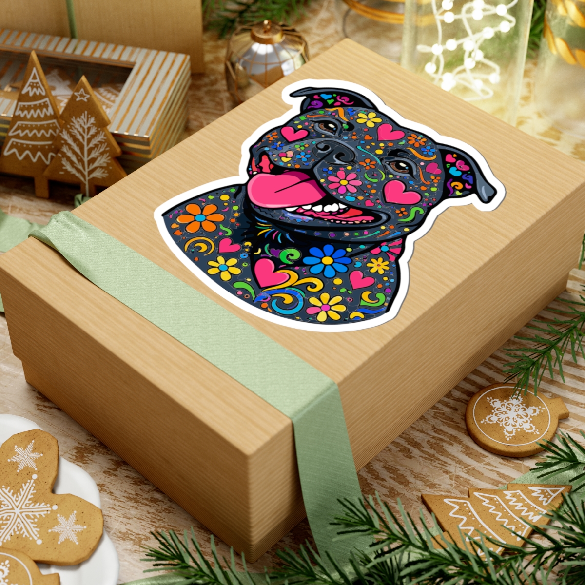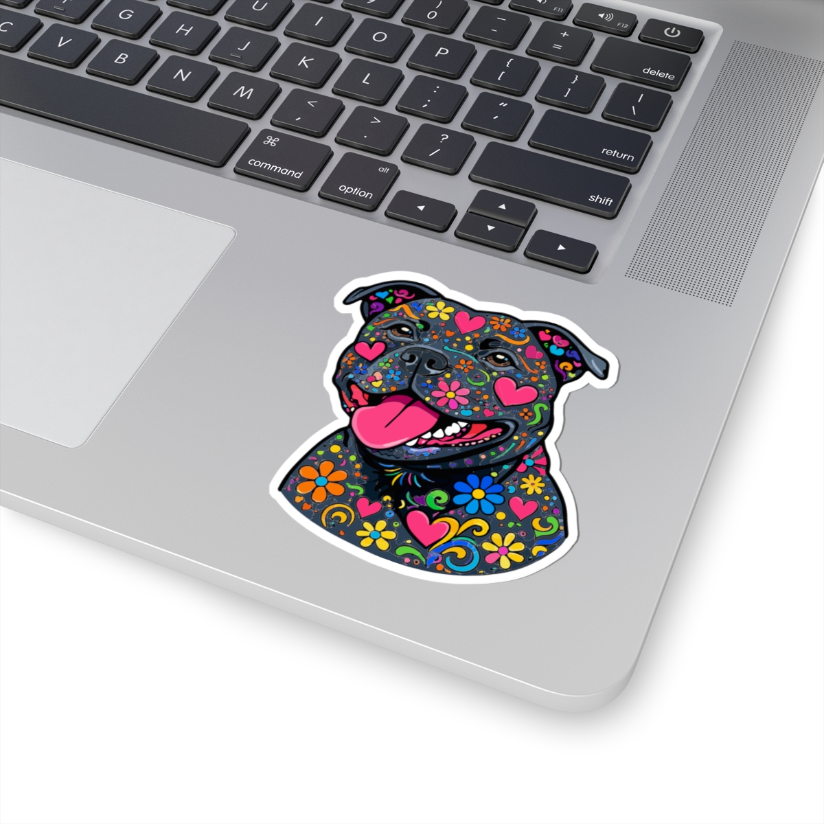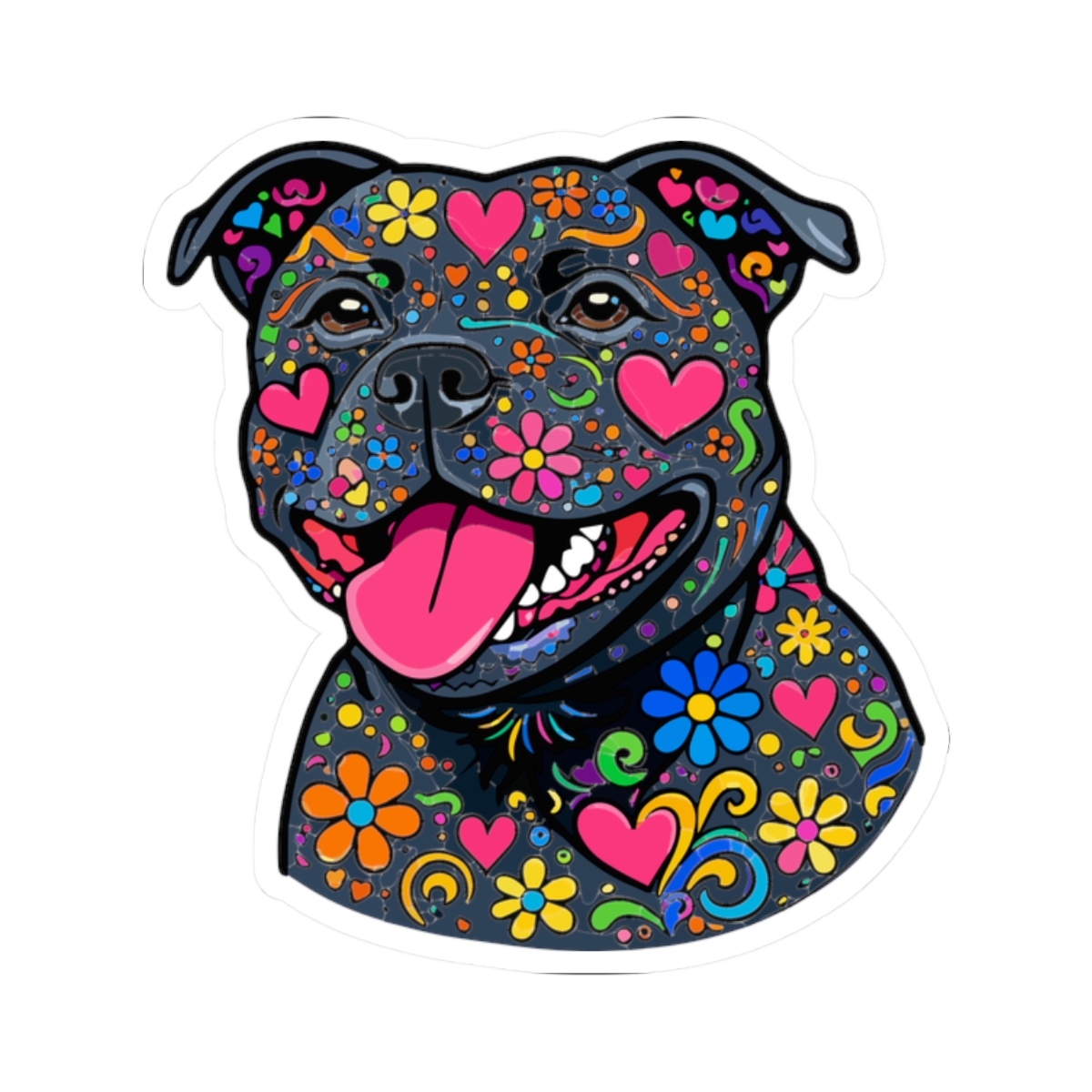 Bright, joyful sticker of a smiling Stafford rendered in vibrant, folk-art patterns. The glossy kiss-cut vinyl brings out neon-like colors and crisp edges — hearts, flowers, and swirling dots dance across the dog’s face and chest. It sticks smoothly to laptops, journals, water-bottle sleeves, and windows, adding an instant pop of personality and warmth to everyday gear. This design reads like a little celebration: playful, affectionate, and impossible to ignore. It’s made from durable vinyl with a permanent adhesive for long-lasting indoor decoration and comes in both white- and transparent-background options and multiple sizes.