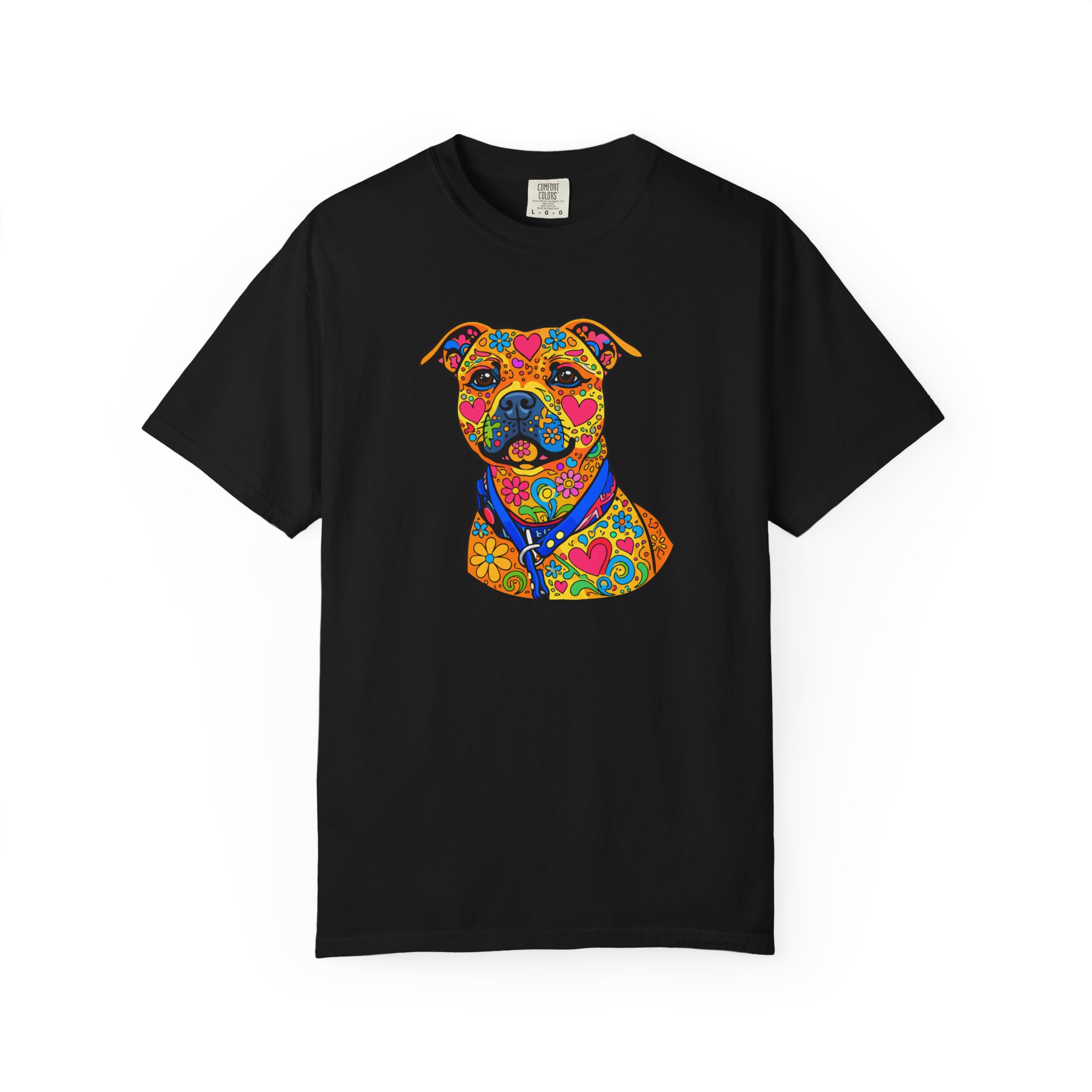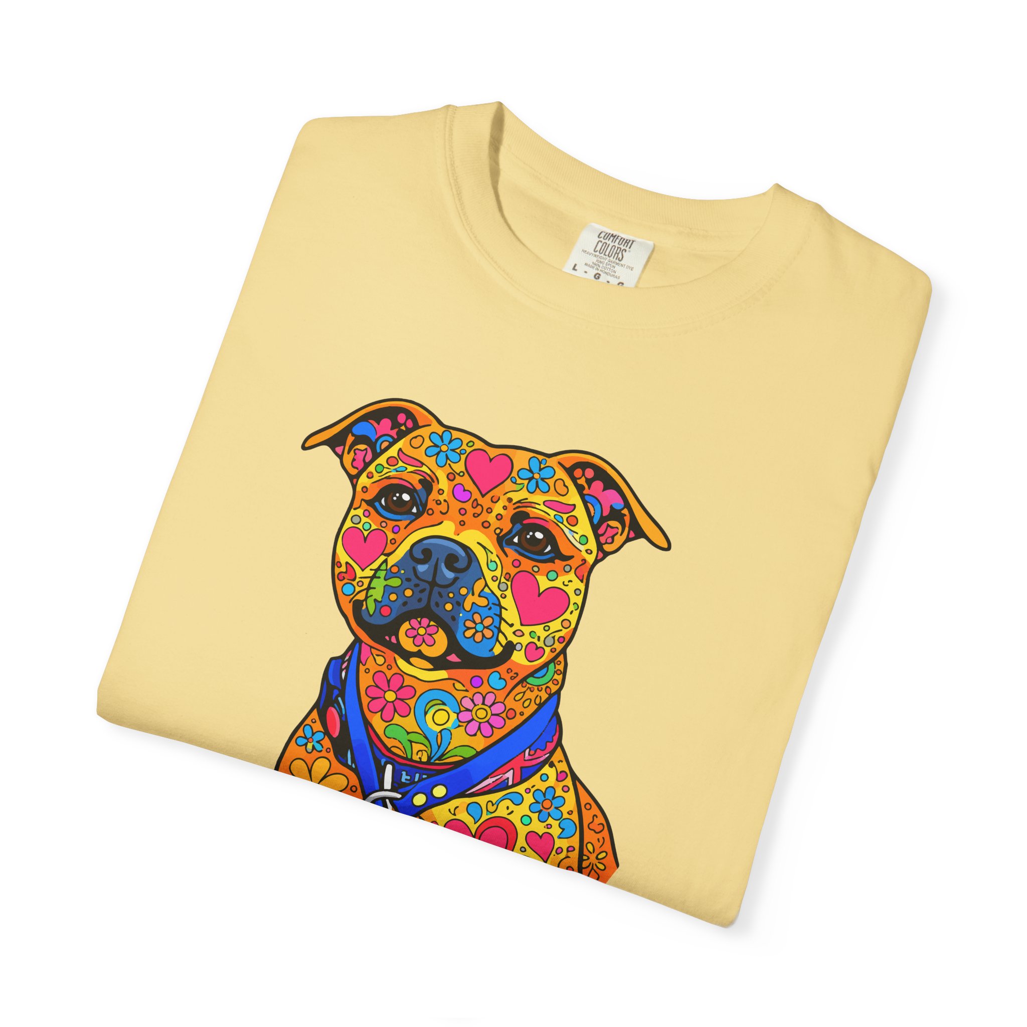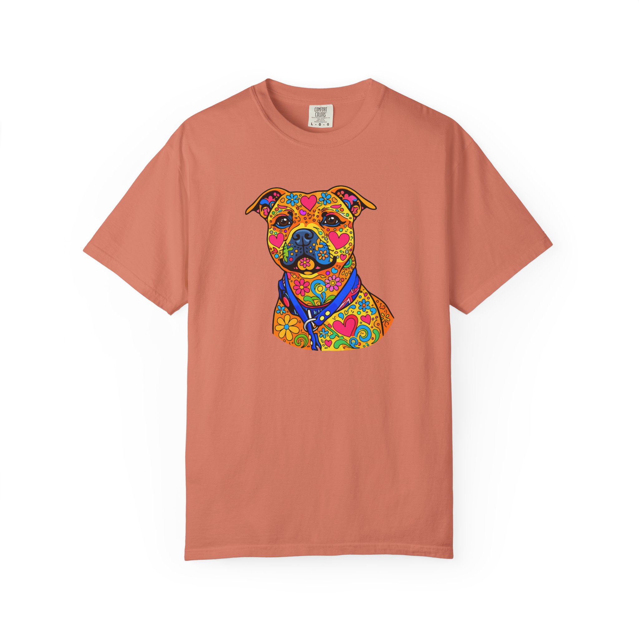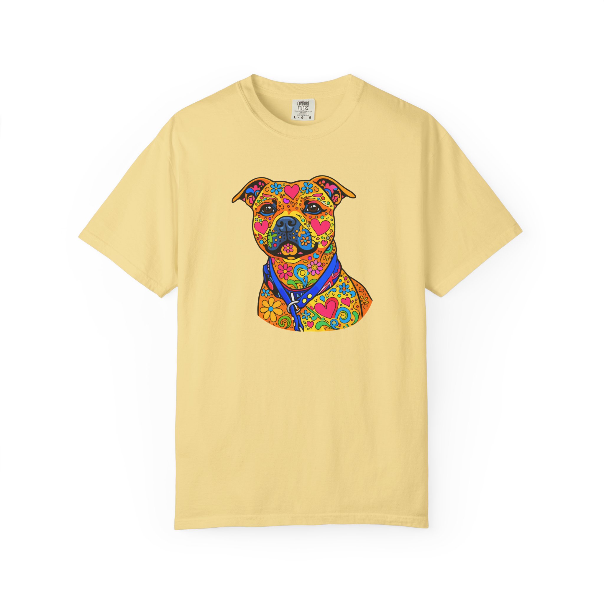 This heavyweight garment-dyed tee brings a burst of color and joy to everyday wear. Soft, broken-in texture meets vibrant artwork: a cheerful, folk-art inspired Stafford portrait. The relaxed fit and durable construction make it a comfortable layer for long walks, casual weekends, or cozy afternoons at a dog show. It wears in beautifully over time, keeping the printed art lively against a lived-in background. Wear it when you want brightness without fuss — the kind of shirt that starts conversations and keeps its shape through repeat wears.