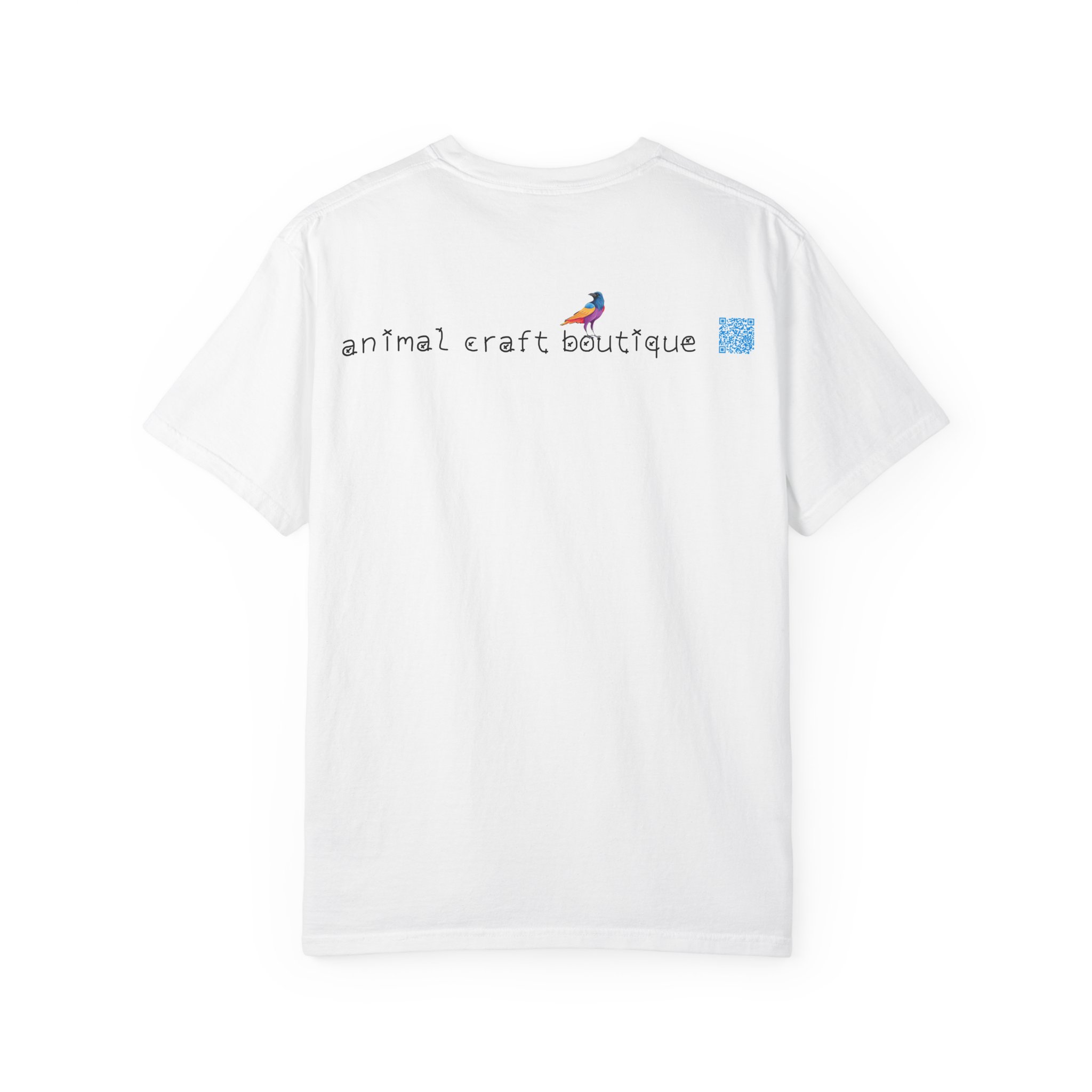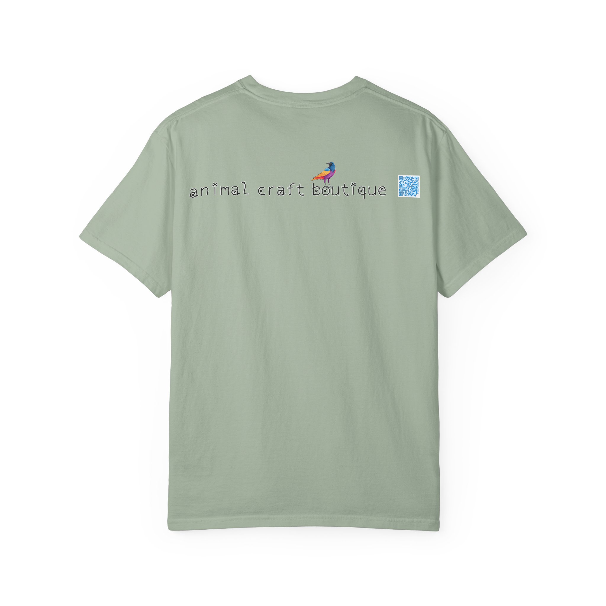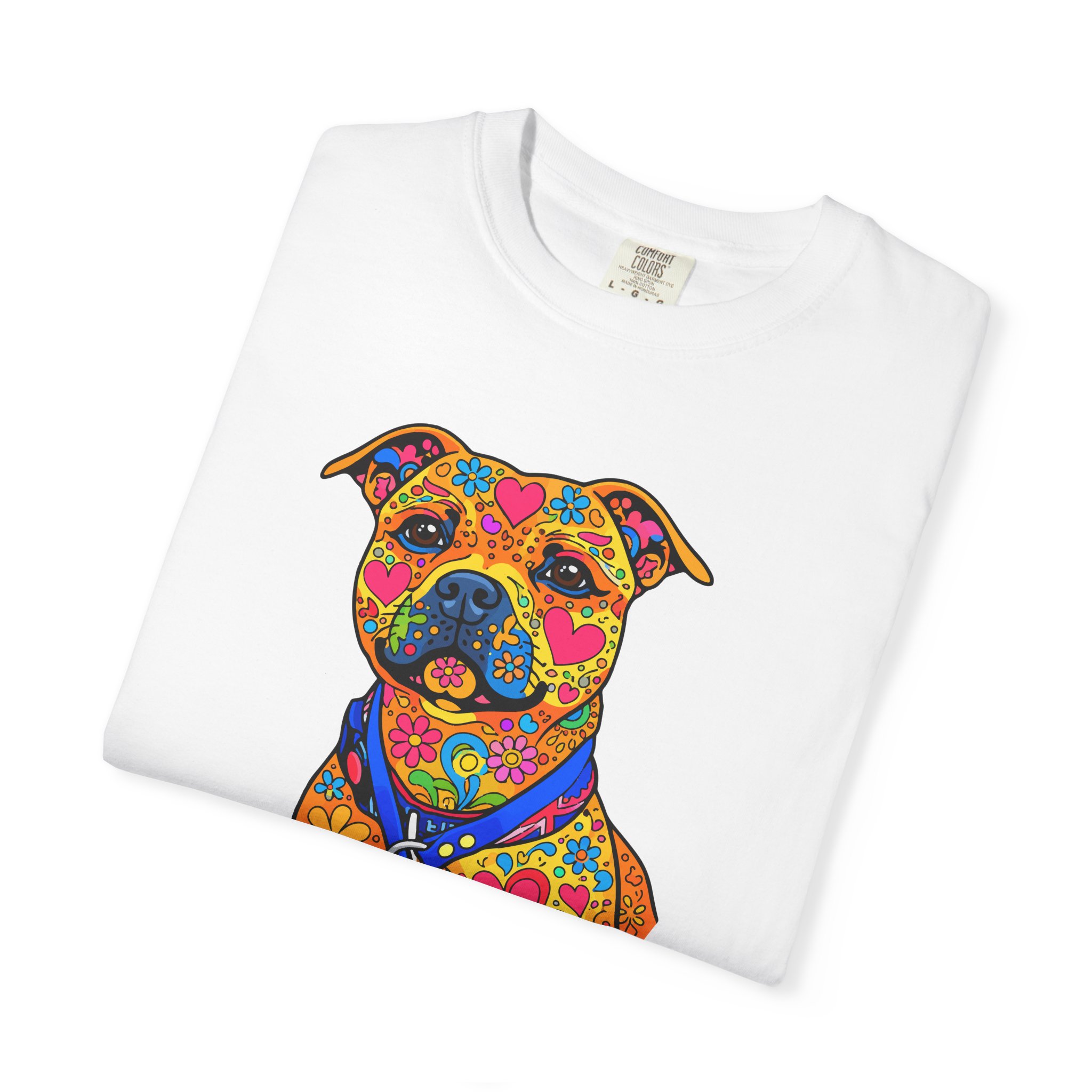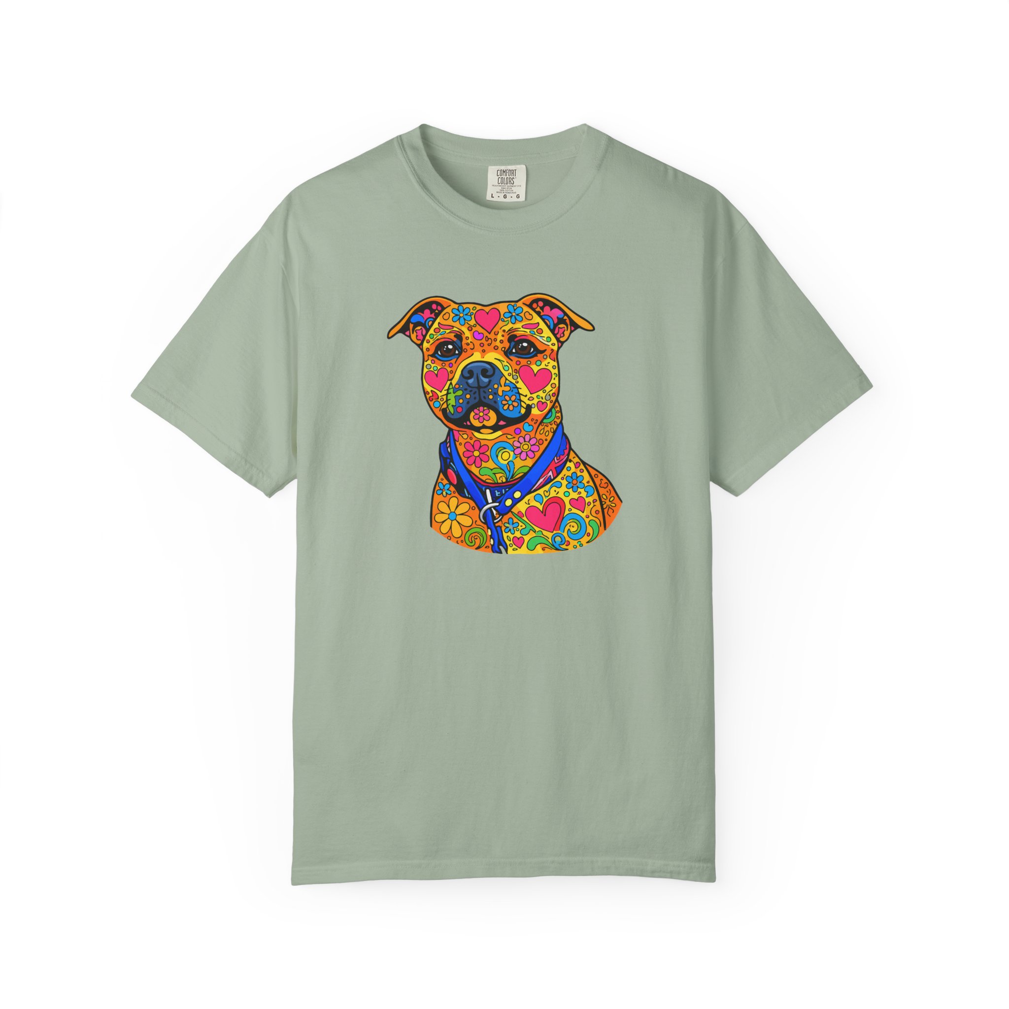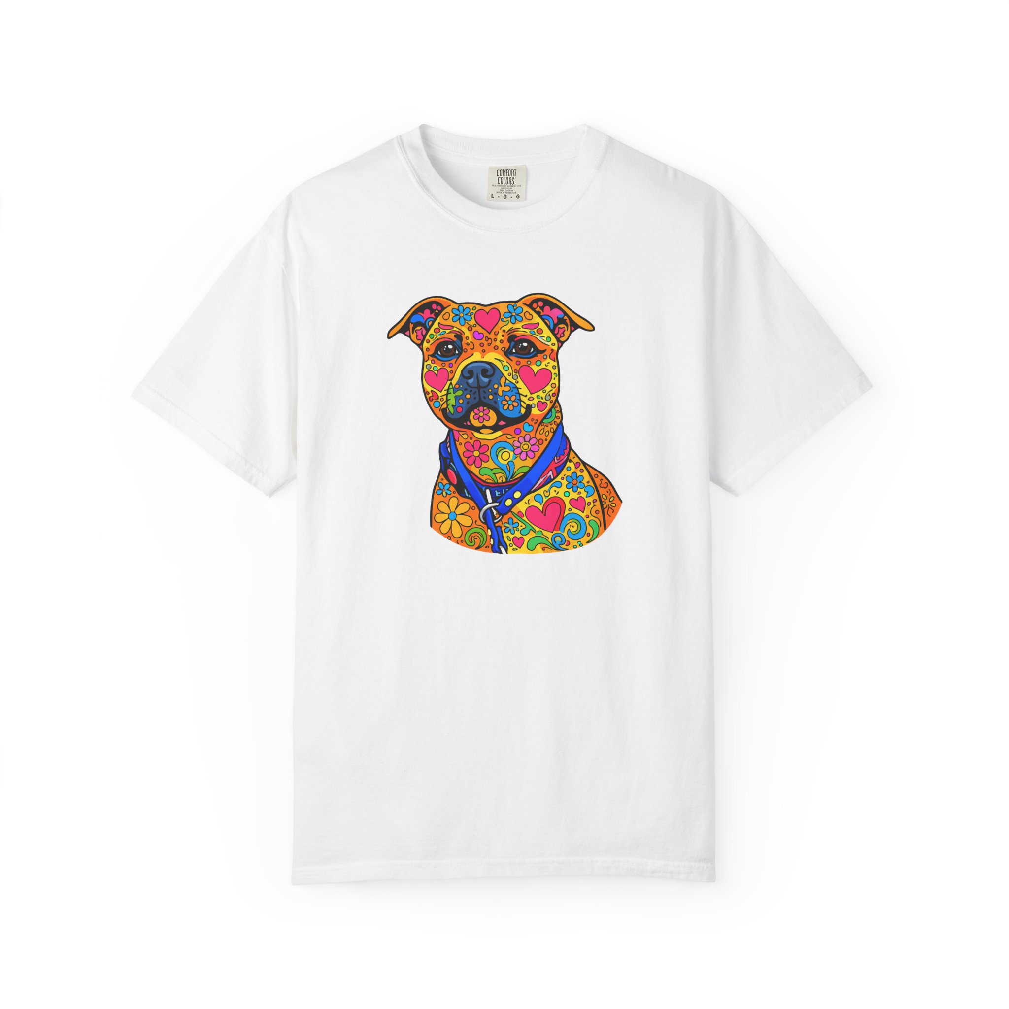 This heavyweight garment-dyed tee brings a burst of color and joy to everyday wear. Soft, broken-in texture meets vibrant artwork: a cheerful, folk-art inspired Stafford portrait. The relaxed fit and durable construction make it a comfortable layer for long walks, casual weekends, or cozy afternoons at a dog show. It wears in beautifully over time, keeping the printed art lively against a lived-in background. Wear it when you want brightness without fuss — the kind of shirt that starts conversations and keeps its shape through repeat wears.