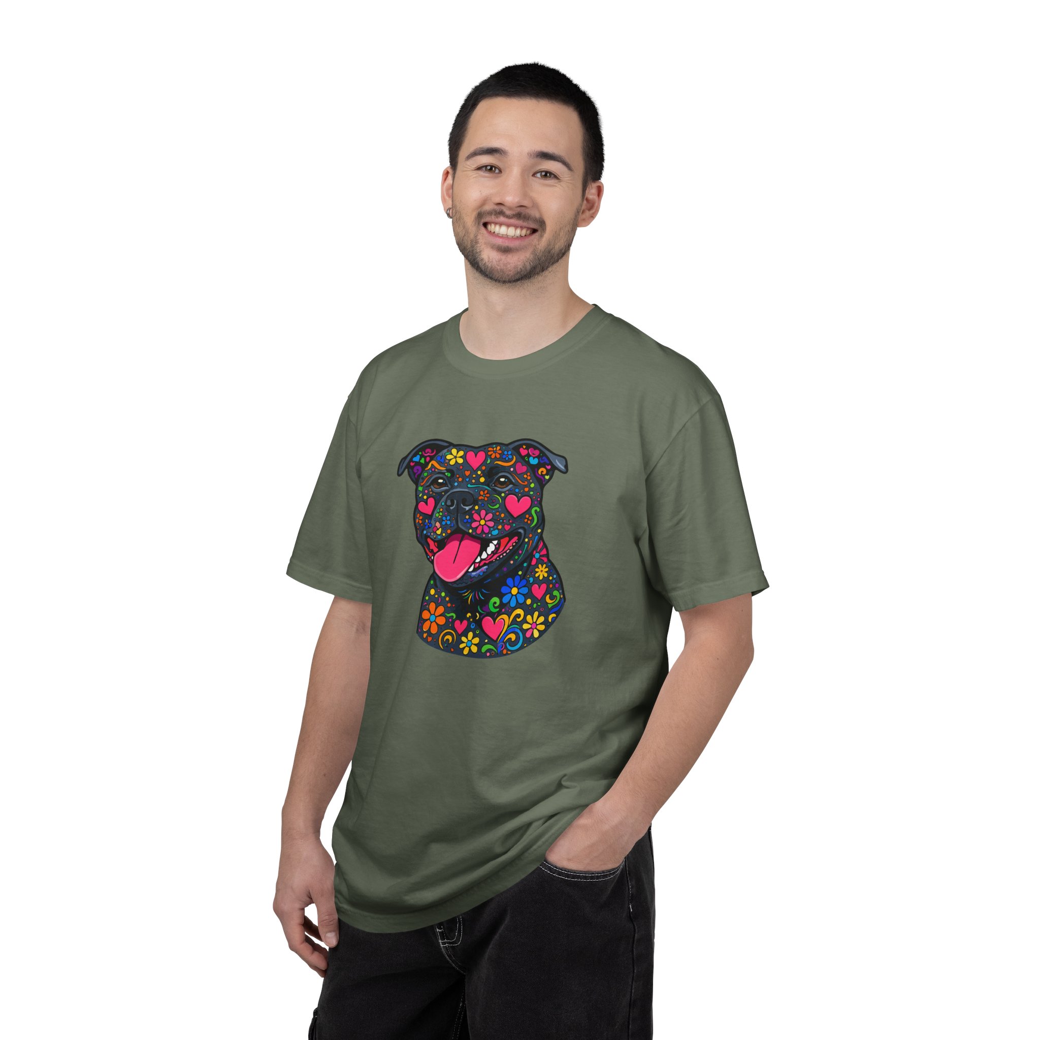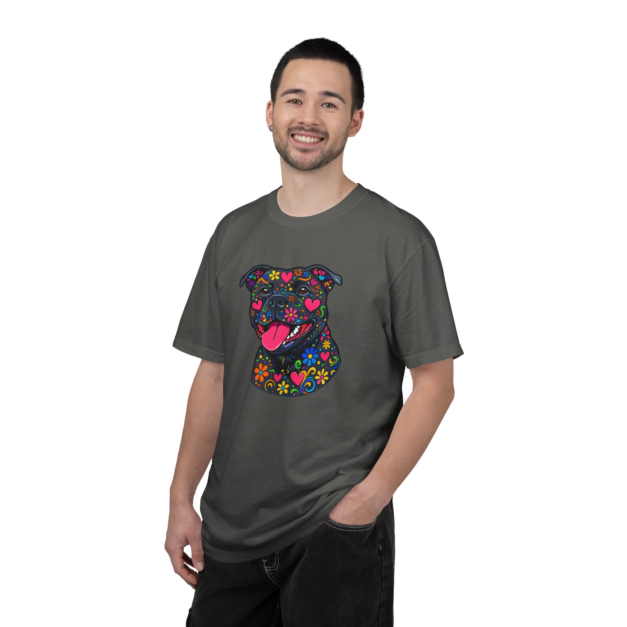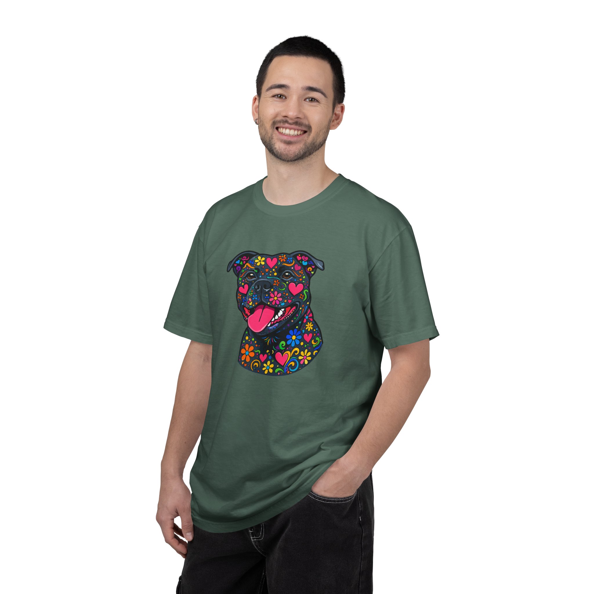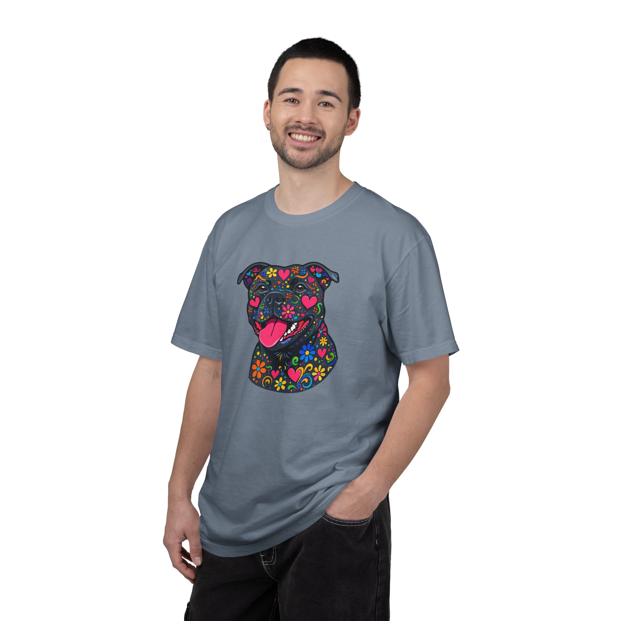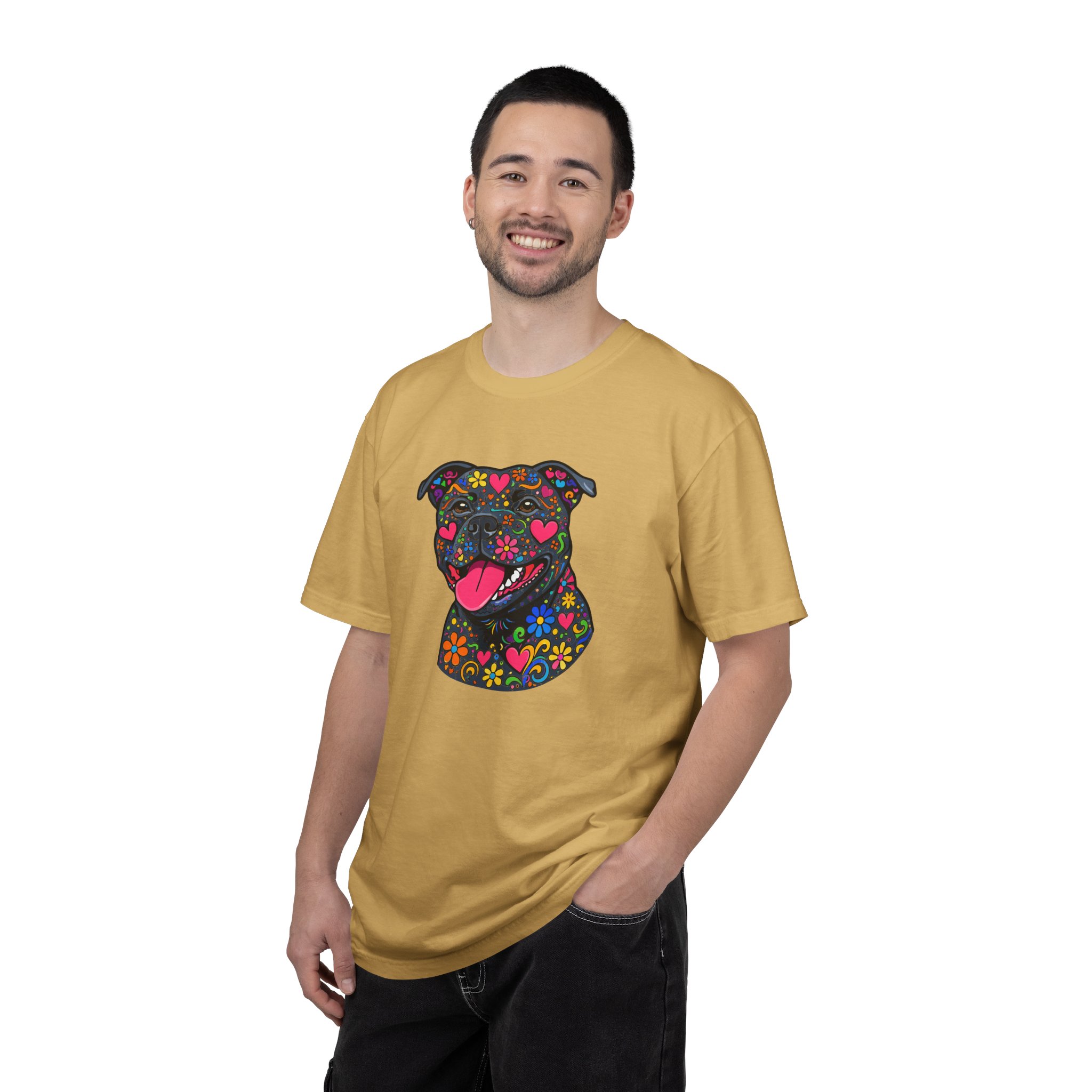 This heavyweight, garment-dyed tee brings a playful, colorful energy to everyday wear. The relaxed fit and soft, post-dye texture feel lived-in from day one, while the vibrant floral-sugar-skull inspired Stafford illustration anchors the shirt with personality — bright hearts, blooms, and cheerful details that pop against the dyed cotton. Wear it on long walks, at casual meetups, or when you want your favorite pup-inspired art to do the talking. The sewn-in label and double-needle stitched seams mean it holds up to repeated wear and washings without losing shape or charm. Pick a bold color to amplify the print or a soft neutral to let the artwork shine.