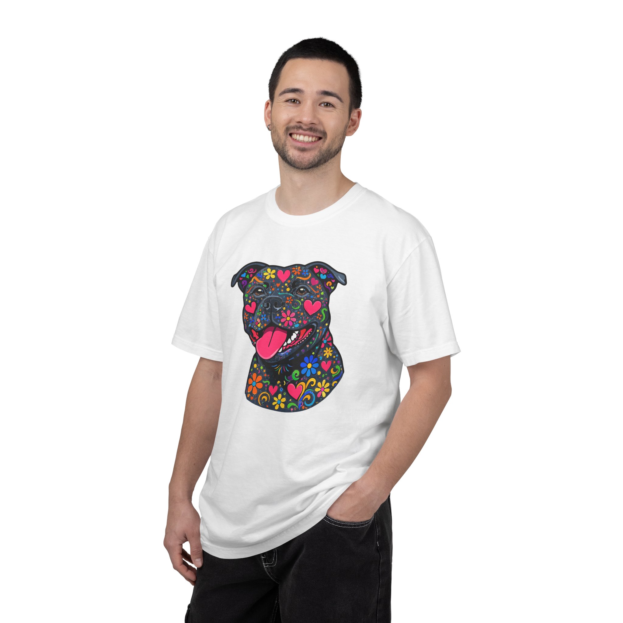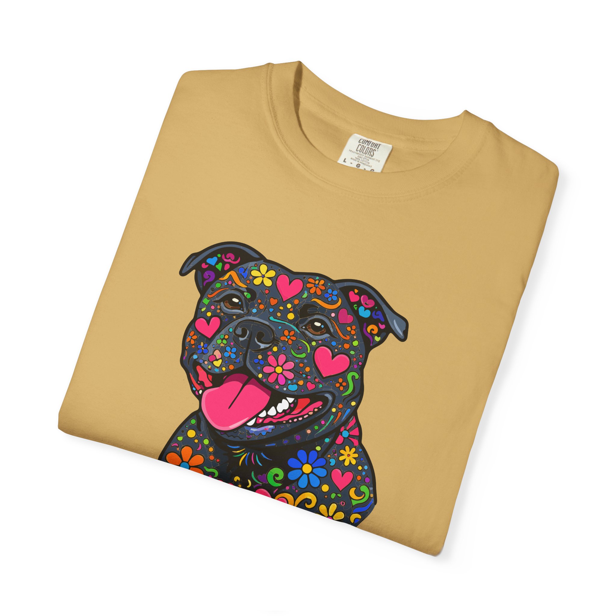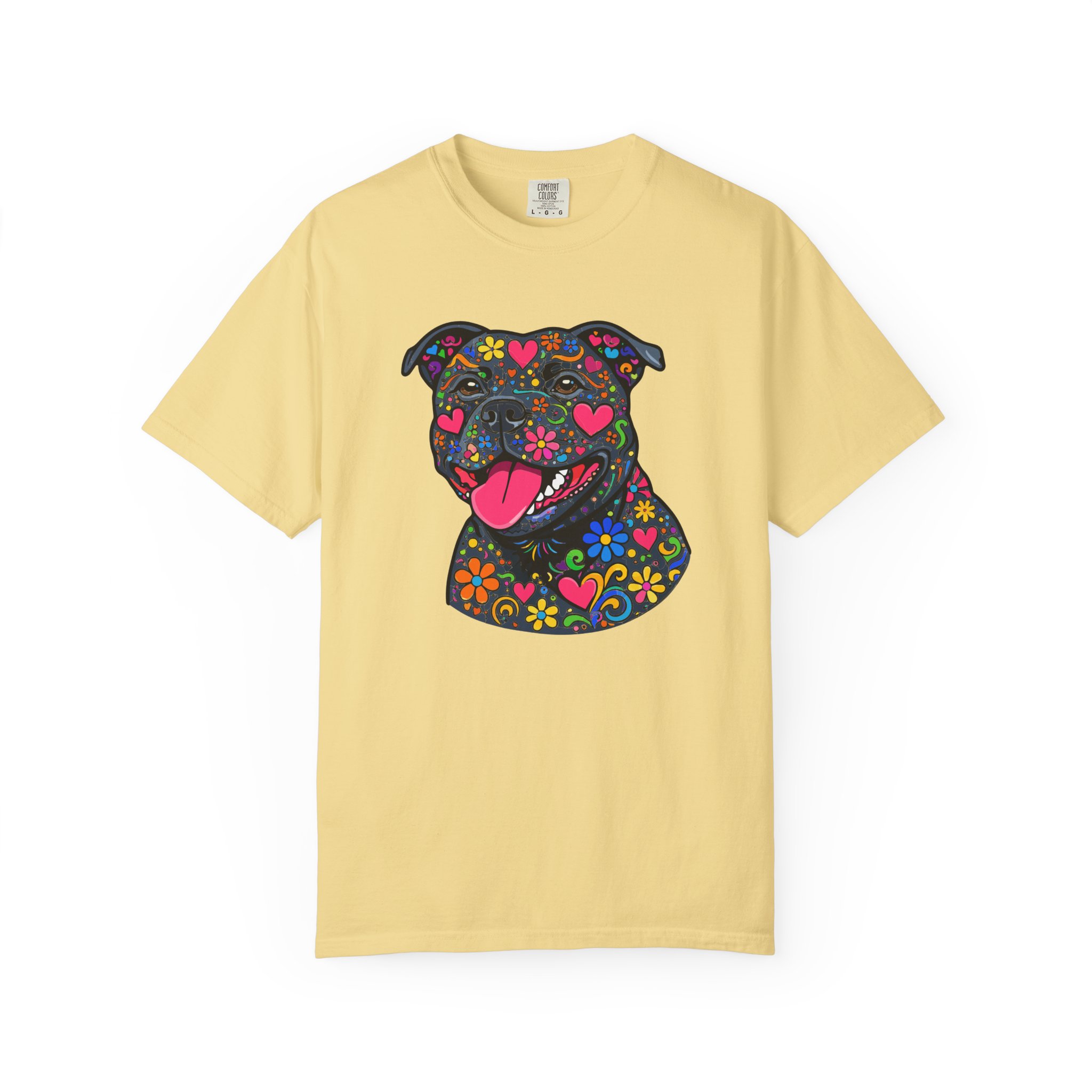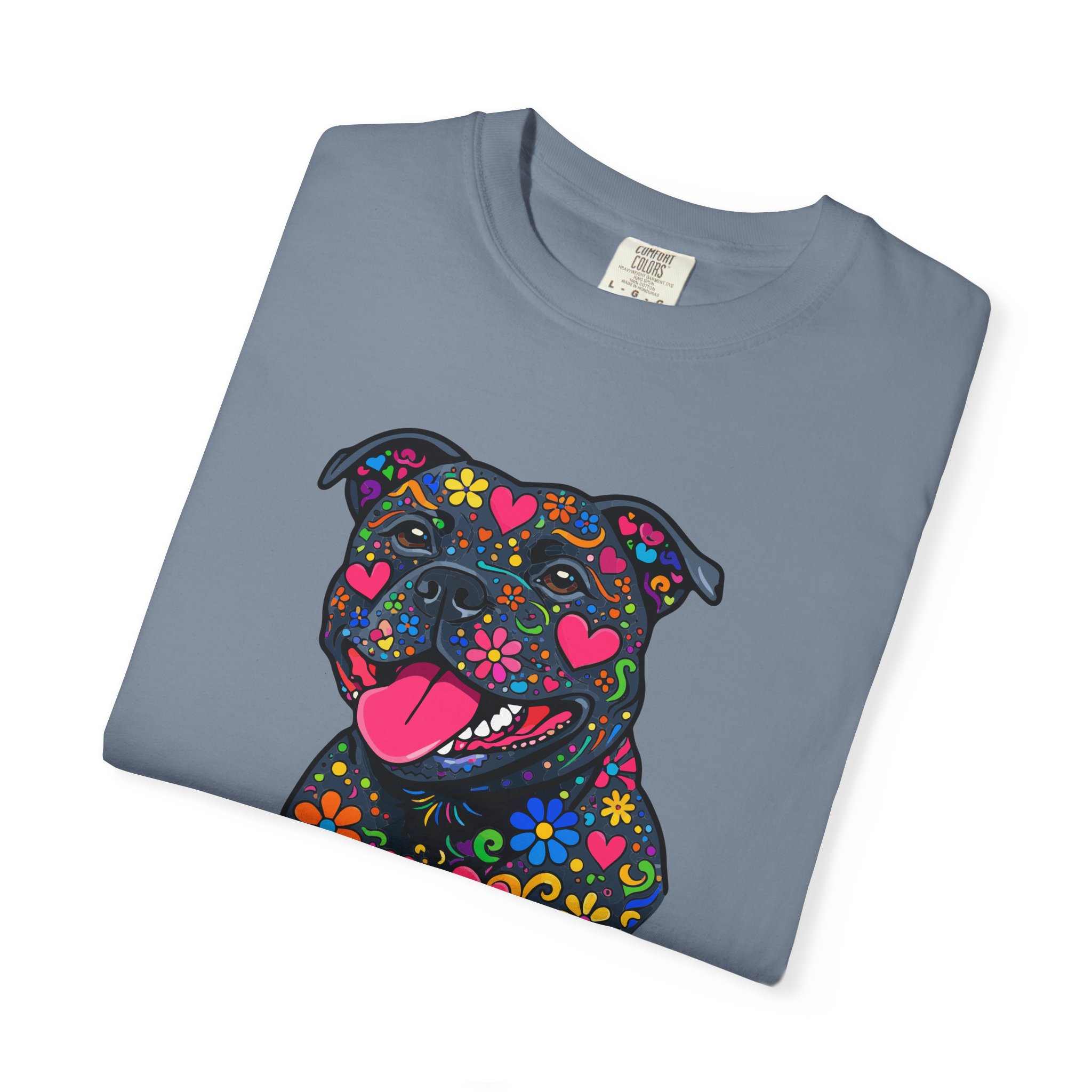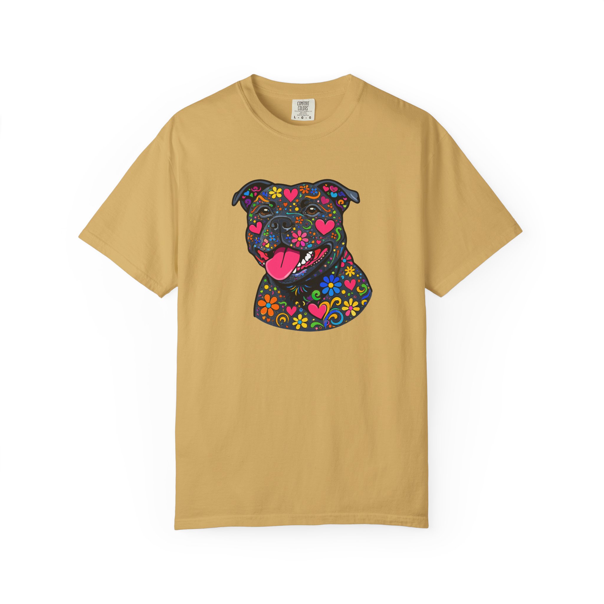 This heavyweight, garment-dyed tee brings a playful, colorful energy to everyday wear. The relaxed fit and soft, post-dye texture feel lived-in from day one, while the vibrant floral-sugar-skull inspired Stafford illustration anchors the shirt with personality — bright hearts, blooms, and cheerful details that pop against the dyed cotton. Wear it on long walks, at casual meetups, or when you want your favorite pup-inspired art to do the talking. The sewn-in label and double-needle stitched seams mean it holds up to repeated wear and washings without losing shape or charm. Pick a bold color to amplify the print or a soft neutral to let the artwork shine.