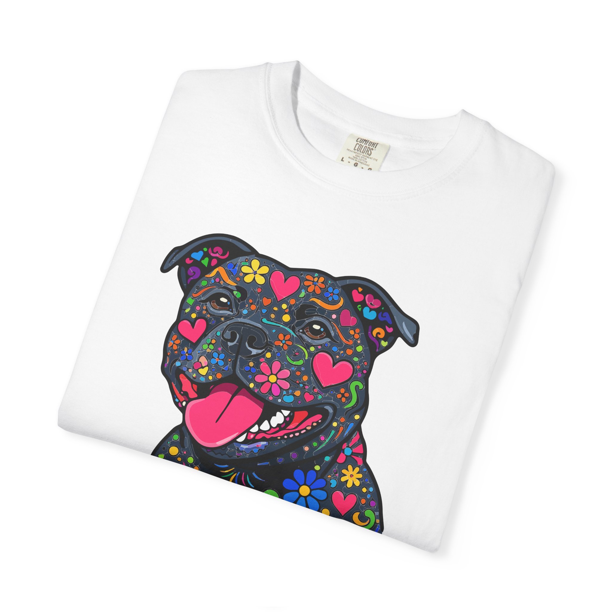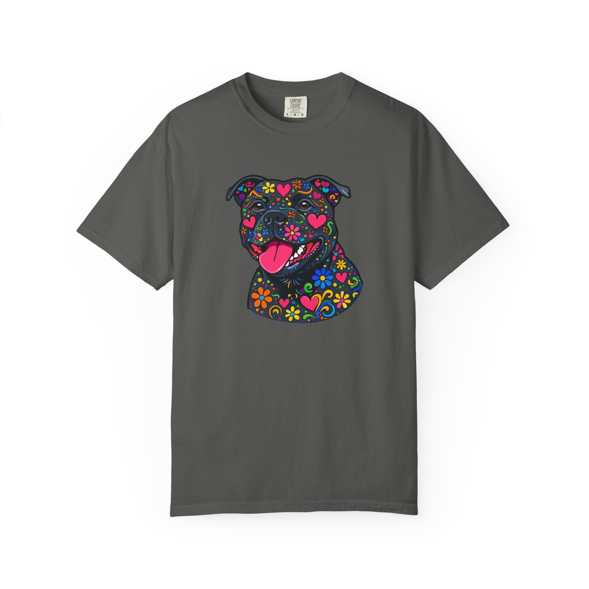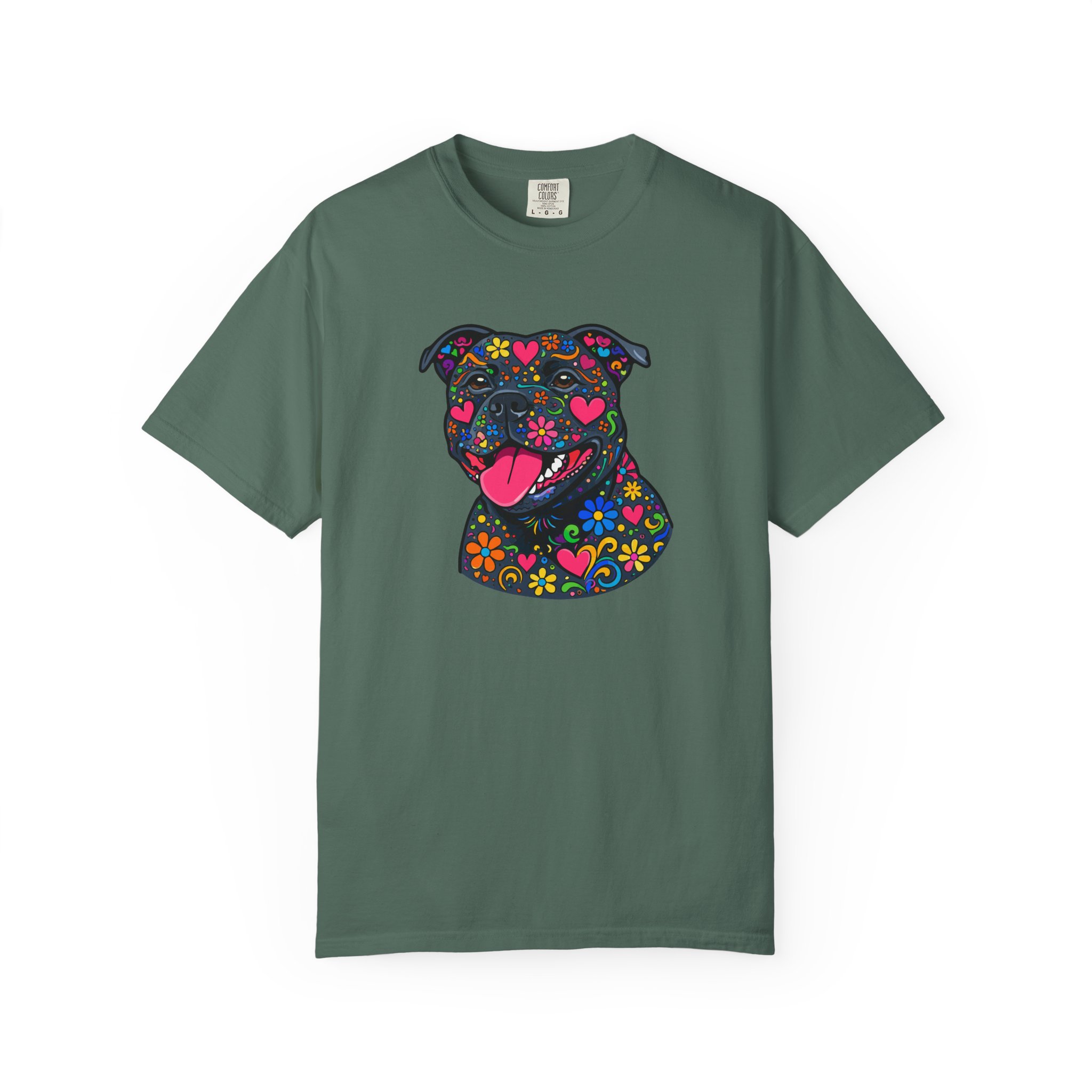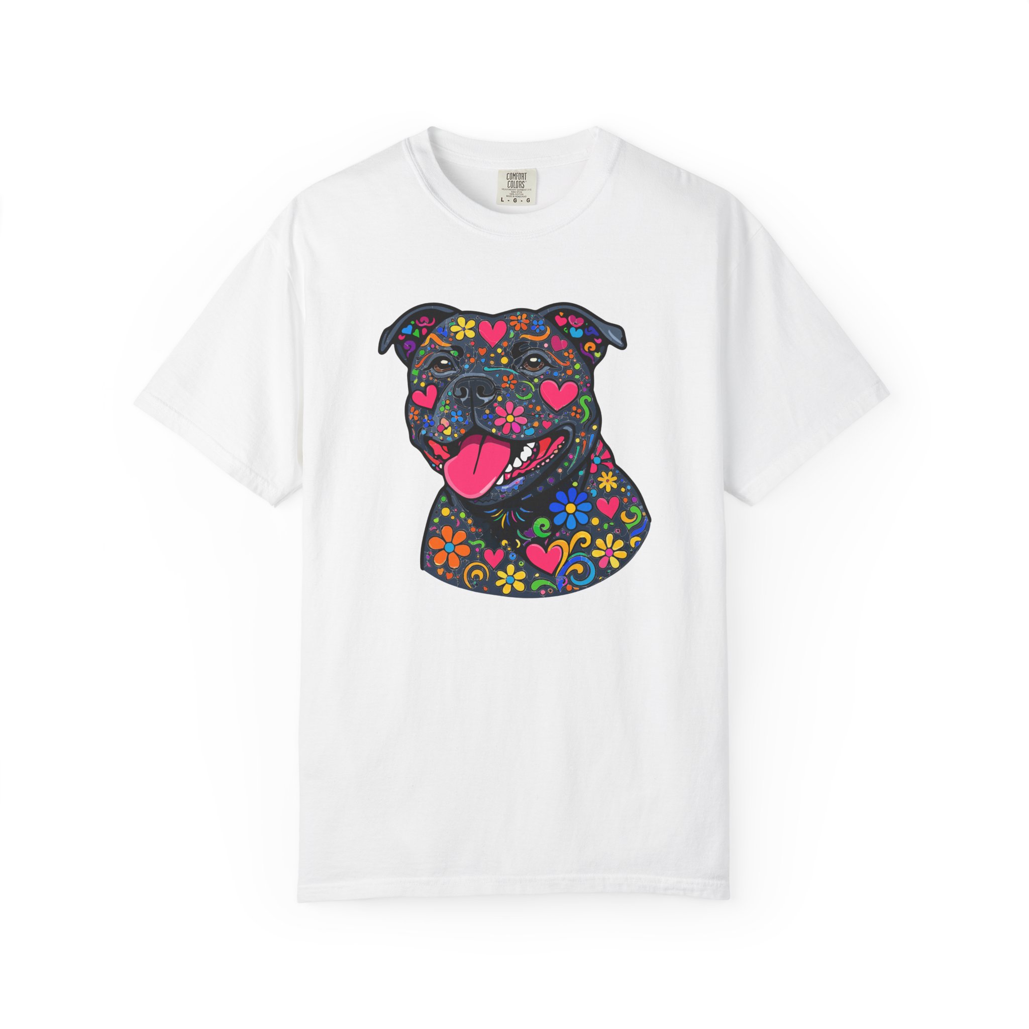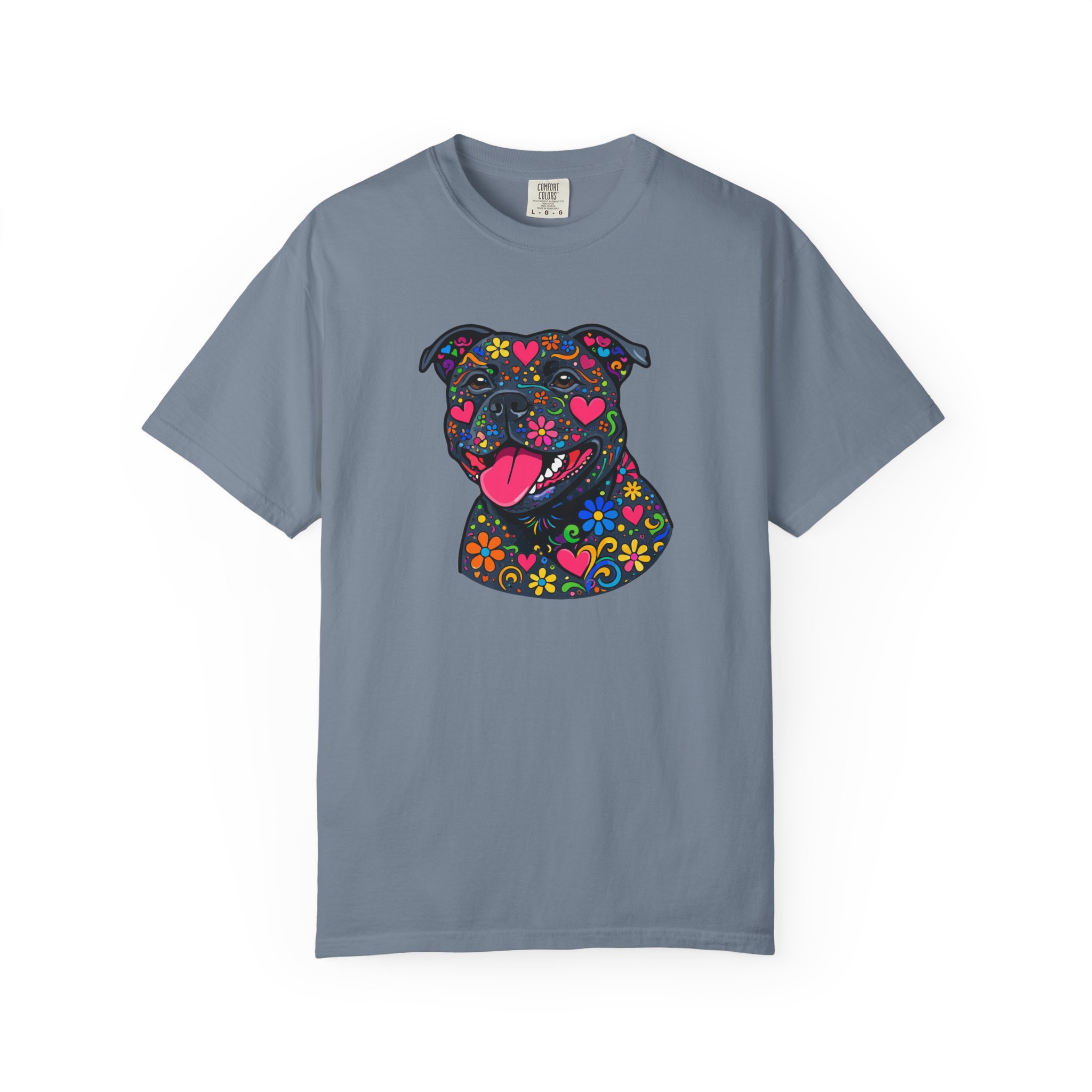 This heavyweight, garment-dyed tee brings a playful, colorful energy to everyday wear. The relaxed fit and soft, post-dye texture feel lived-in from day one, while the vibrant floral-sugar-skull inspired Stafford illustration anchors the shirt with personality — bright hearts, blooms, and cheerful details that pop against the dyed cotton. Wear it on long walks, at casual meetups, or when you want your favorite pup-inspired art to do the talking. The sewn-in label and double-needle stitched seams mean it holds up to repeated wear and washings without losing shape or charm. Pick a bold color to amplify the print or a soft neutral to let the artwork shine.