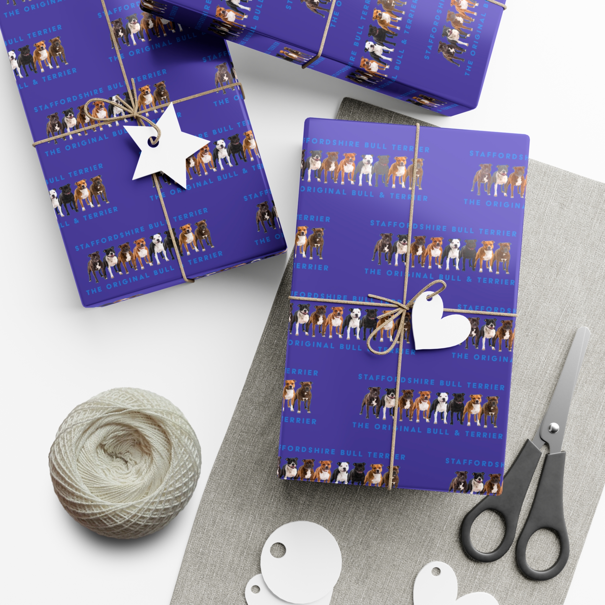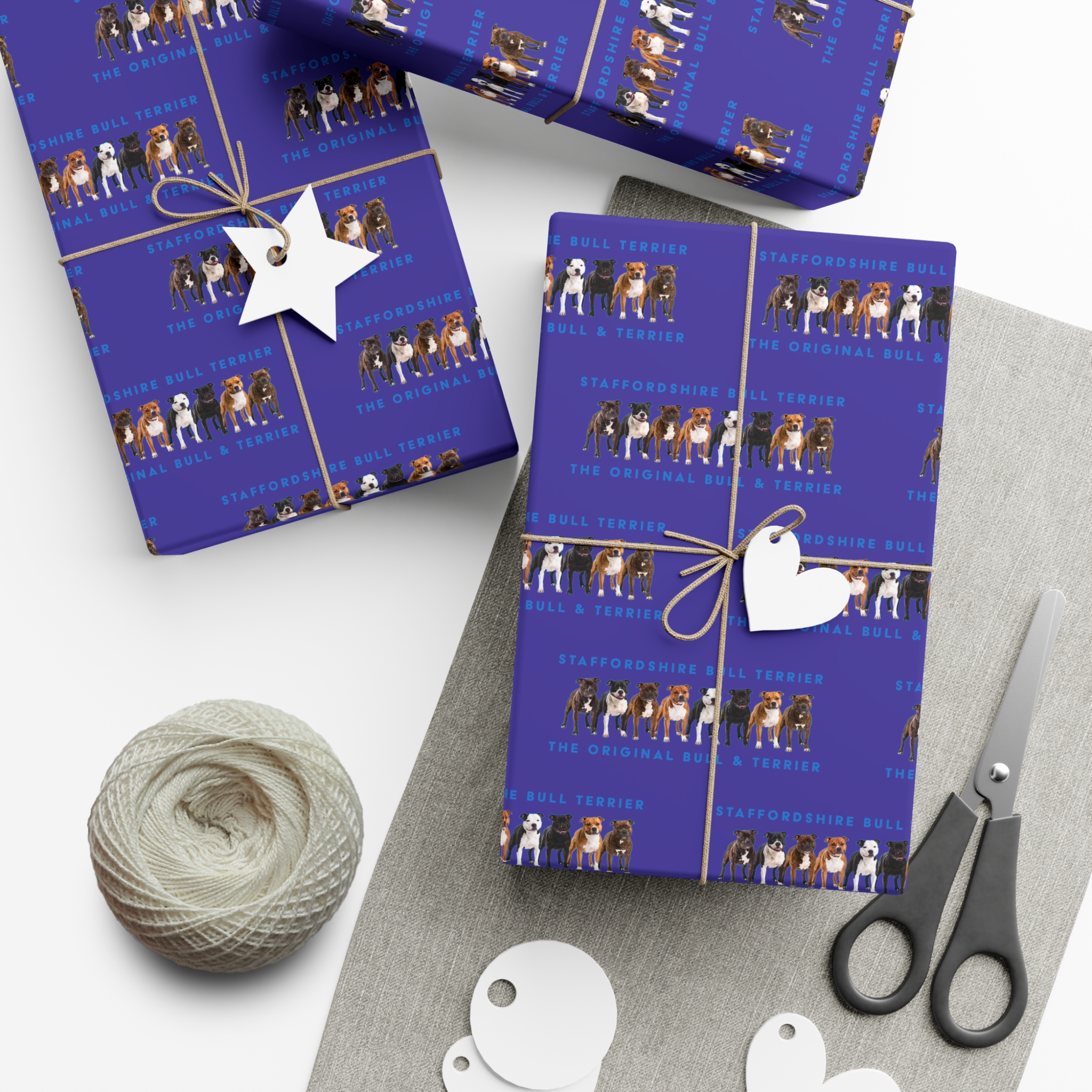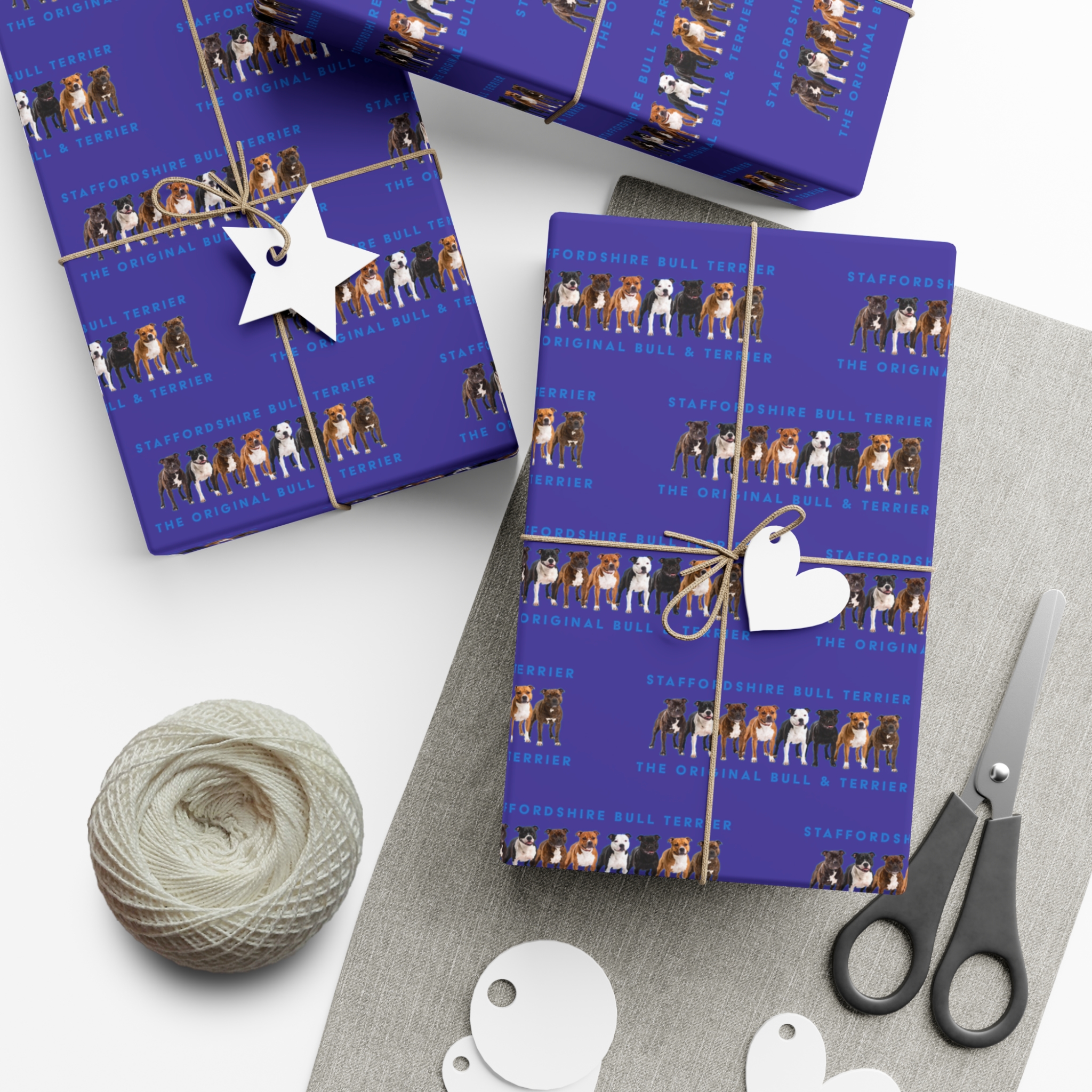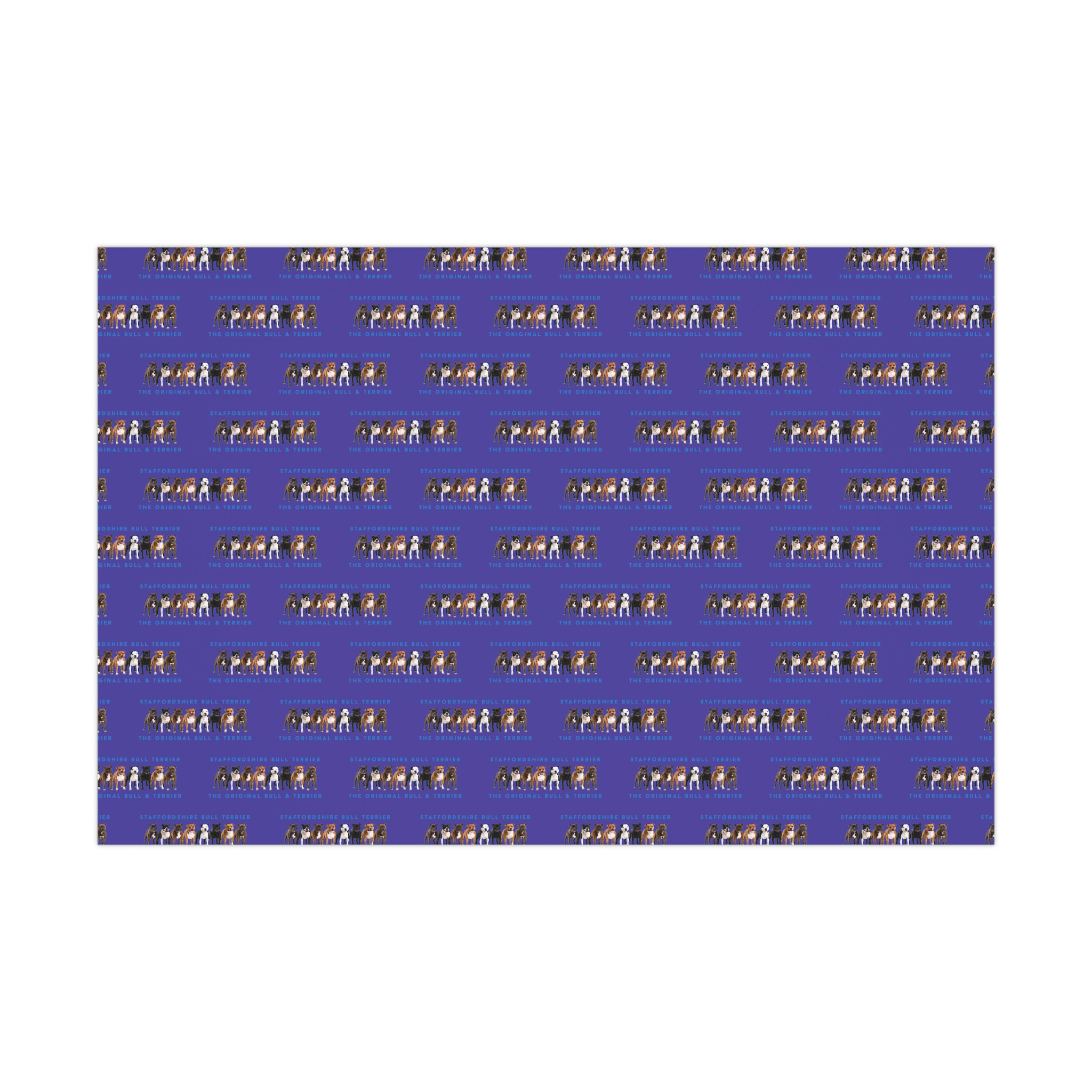 Make any gift bring an even wider smile to the receiver with this Stffordshire Bull Terrier gift wrap paper. Available in two paper finishes (satin, matte), this wrap lets you choose what best fits your audience’s needs. Each sheet is printed using GreenGuard UL Certified inks and the blank paper is made in the USA under strict quality control.