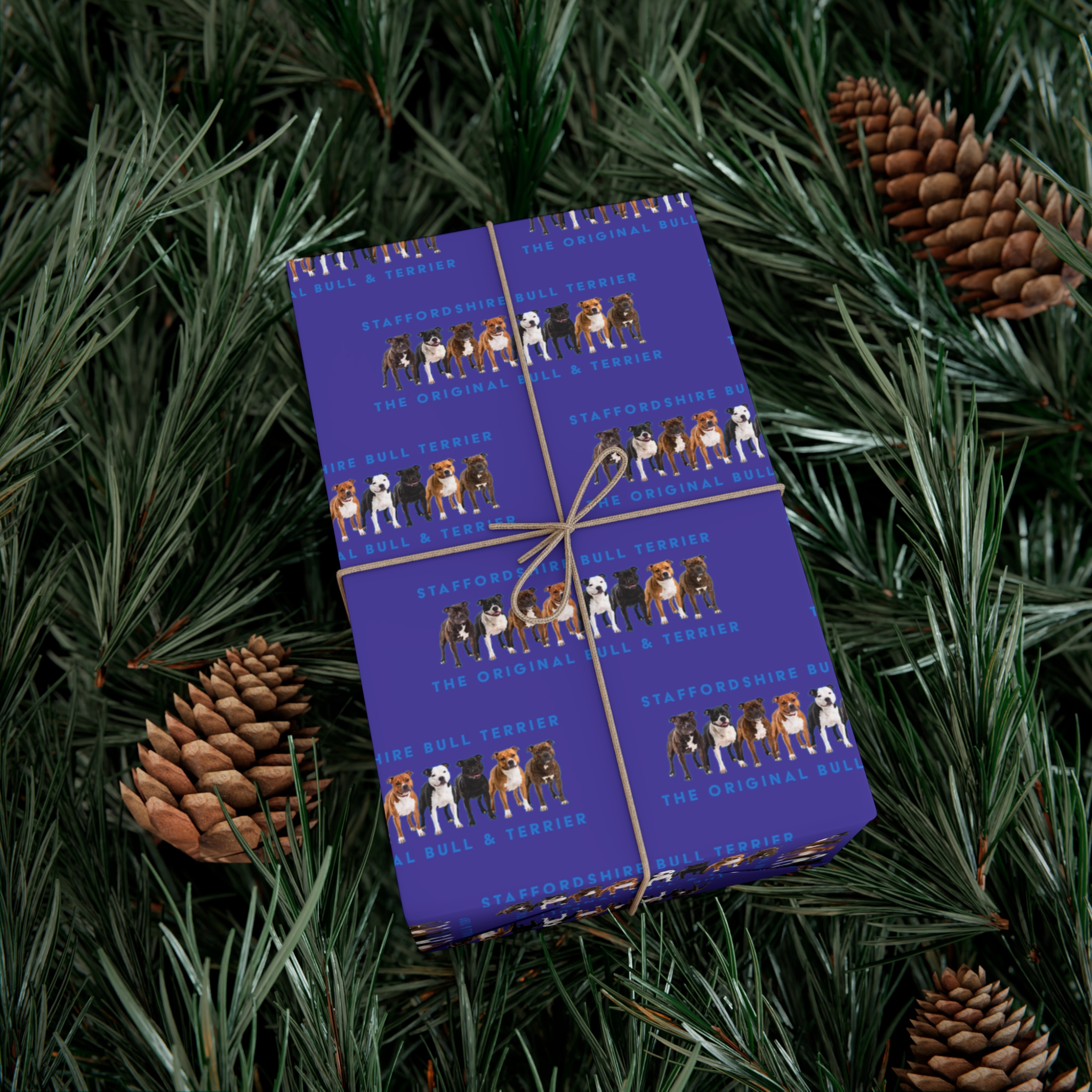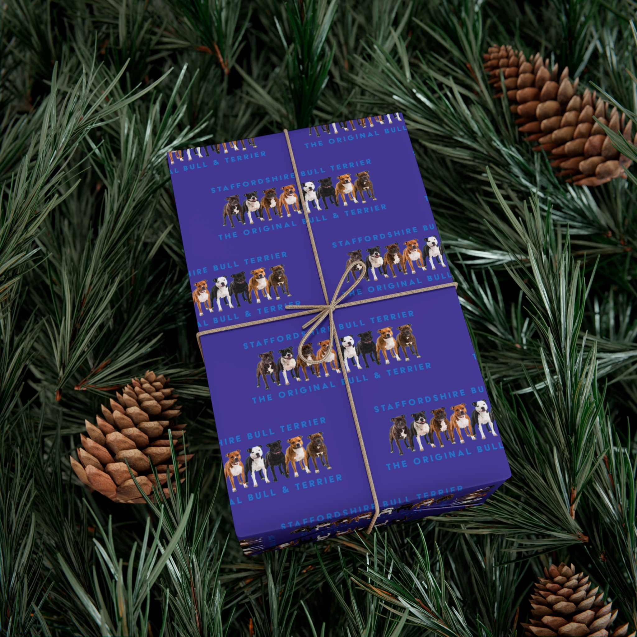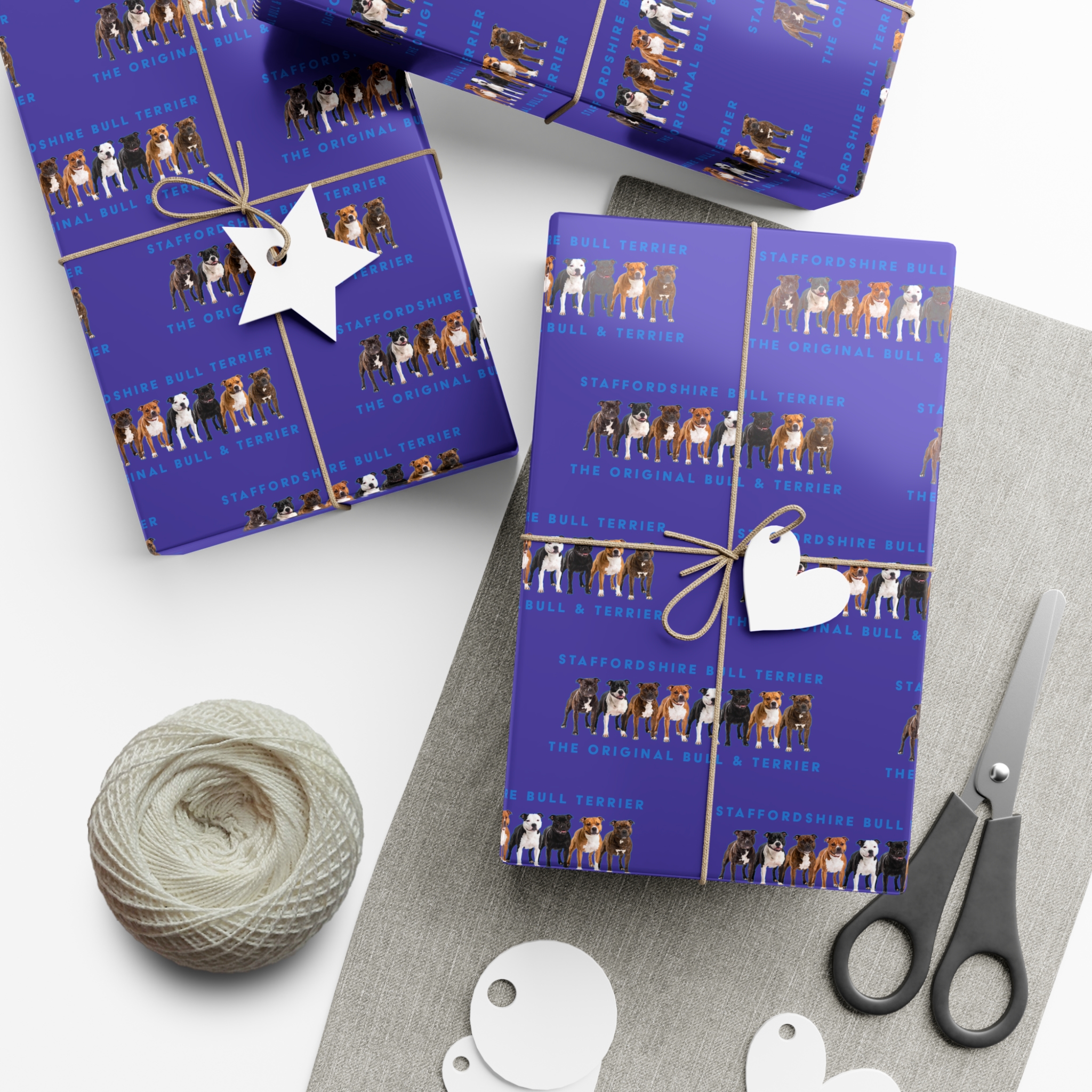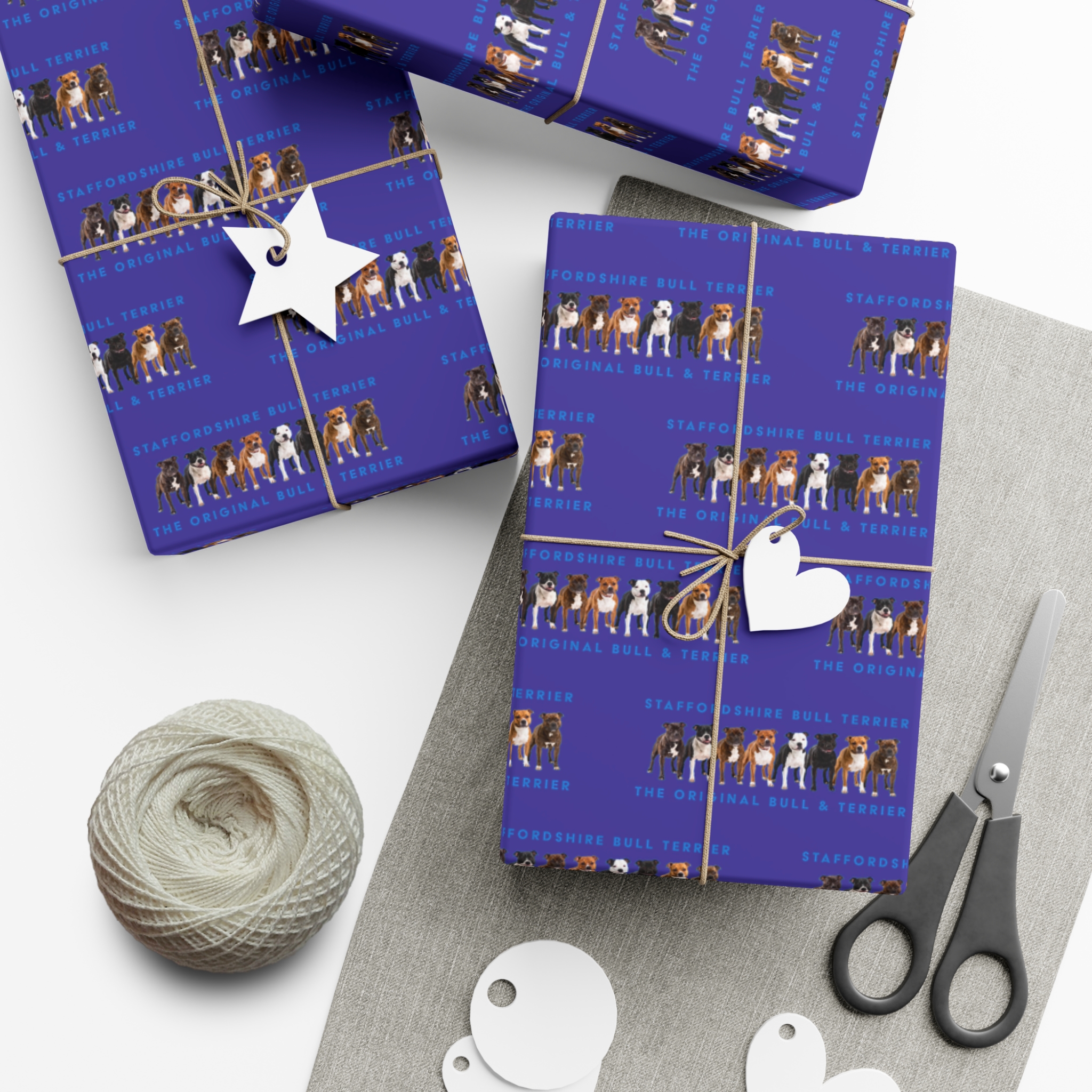 Make any gift bring an even wider smile to the receiver with this Stffordshire Bull Terrier gift wrap paper. Available in two paper finishes (satin, matte), this wrap lets you choose what best fits your audience’s needs. Each sheet is printed using GreenGuard UL Certified inks and the blank paper is made in the USA under strict quality control.